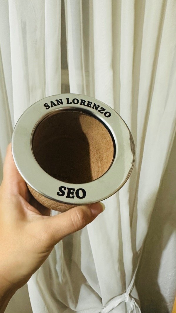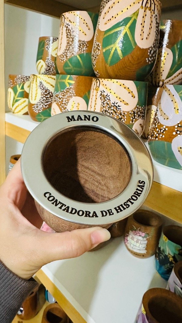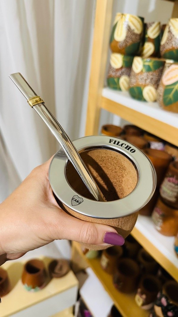 El mate es de madera de algarrobo, la virola es de acero inoxidable